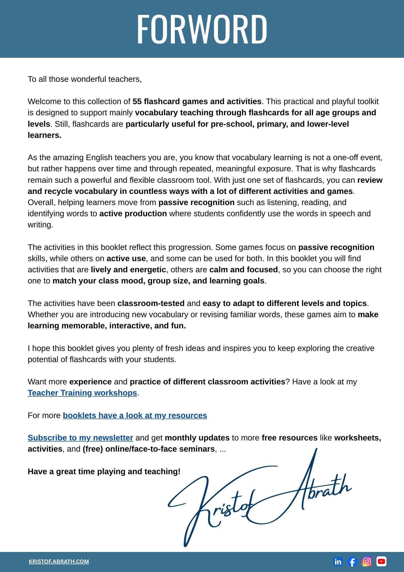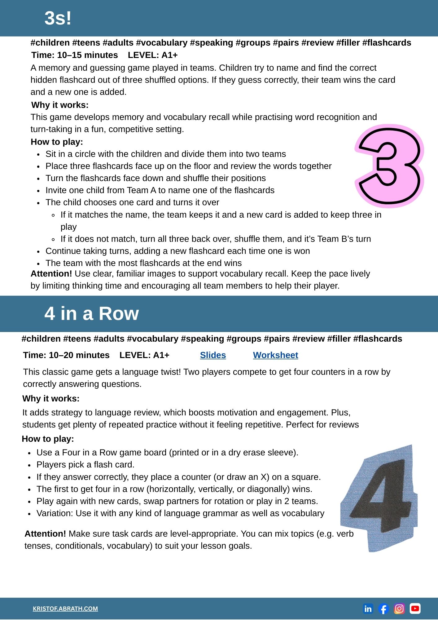 This downloadable booklet includes 55 teacher-approved flashcard games designed for language learners of all ages – especially pre-school, primary, and lower levels. From energetic whole-class games to focused pair work, these activities help students move from passive recognition to confident, active use of new vocabulary.